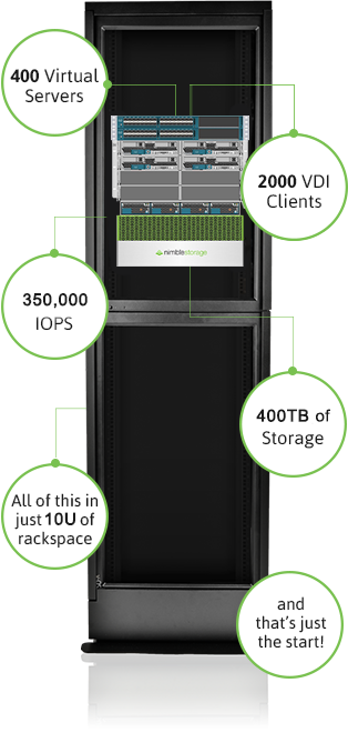 Despite its density and fewer components, SmartStack delivers exceptional performance. With Nimble’s CASL architecture delivering upto 350,000 IOPS from a single 4U array.